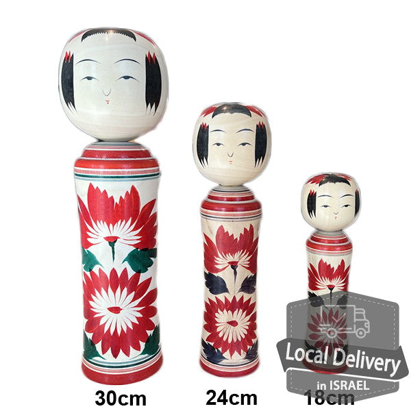 Kakizawa kokeshi studio produces many kind of Kokeshi not only traditional figure. Charm of Kakizawa Kokeshi is that Kokeshi doll has peaceful and cute face, wearing beautiful chrysanthemum dress and even wearing hat.
