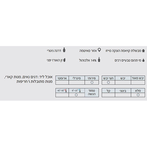 סאקהנוקוני ג'ונמאי 720 מ"לחמיצות מתונה וגוף מאוזן מעניקים לסאקה הזה טעם מרענן ונעים. ניחוחות דמתיים ונגיעות של מתיקות רכה נמסים באלגנטיות על החך. זהו שילוב מהפנטשל עוצמת הסאקה מאקיטה עם הרכות המעודנת של ג’ונמאי – חוויית טעם מלאה ומאוזנת.