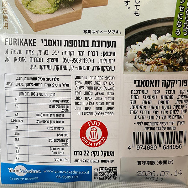 פוריקקה וואסאבי – אבקת תיבול יפני שמורכבת מאצות, שומשום, וואסאבי ממחוז שיזוקה. תוספת הנאה של פיקנטיות וטעם ווסאבי אמיתיים.